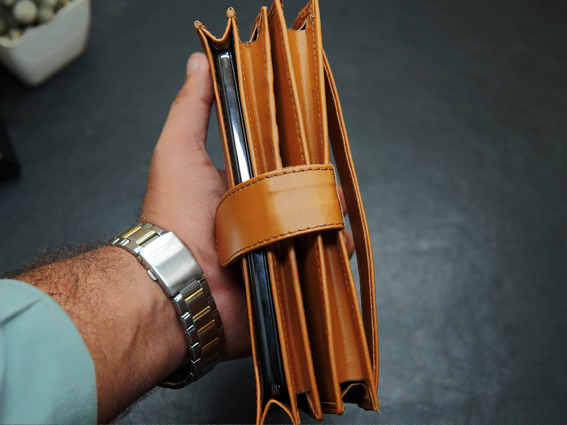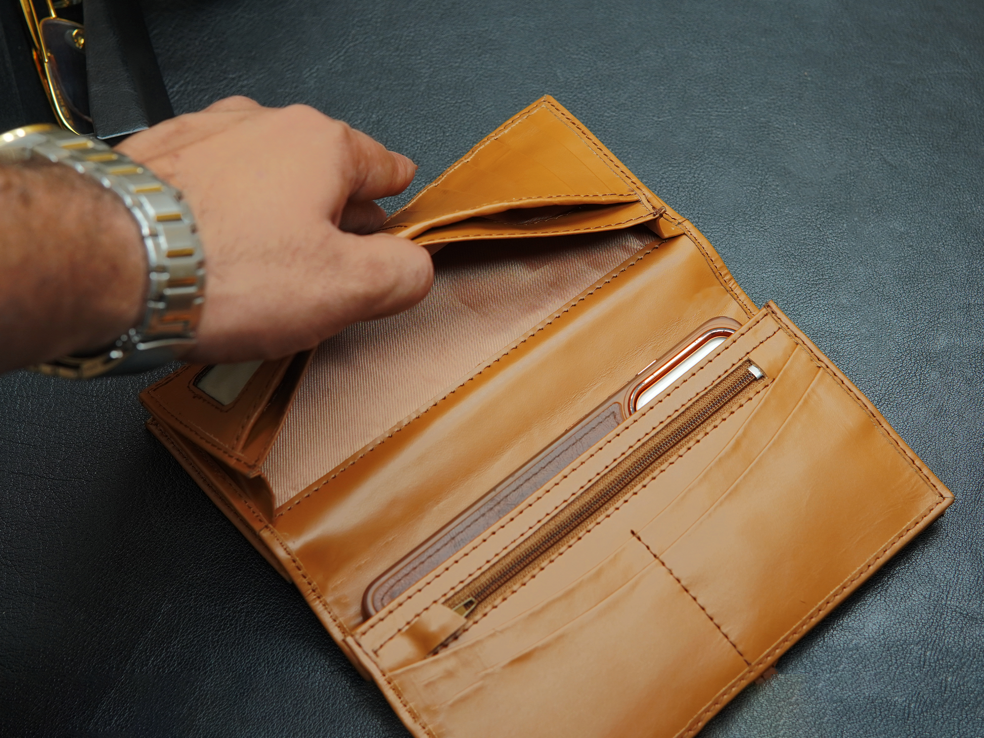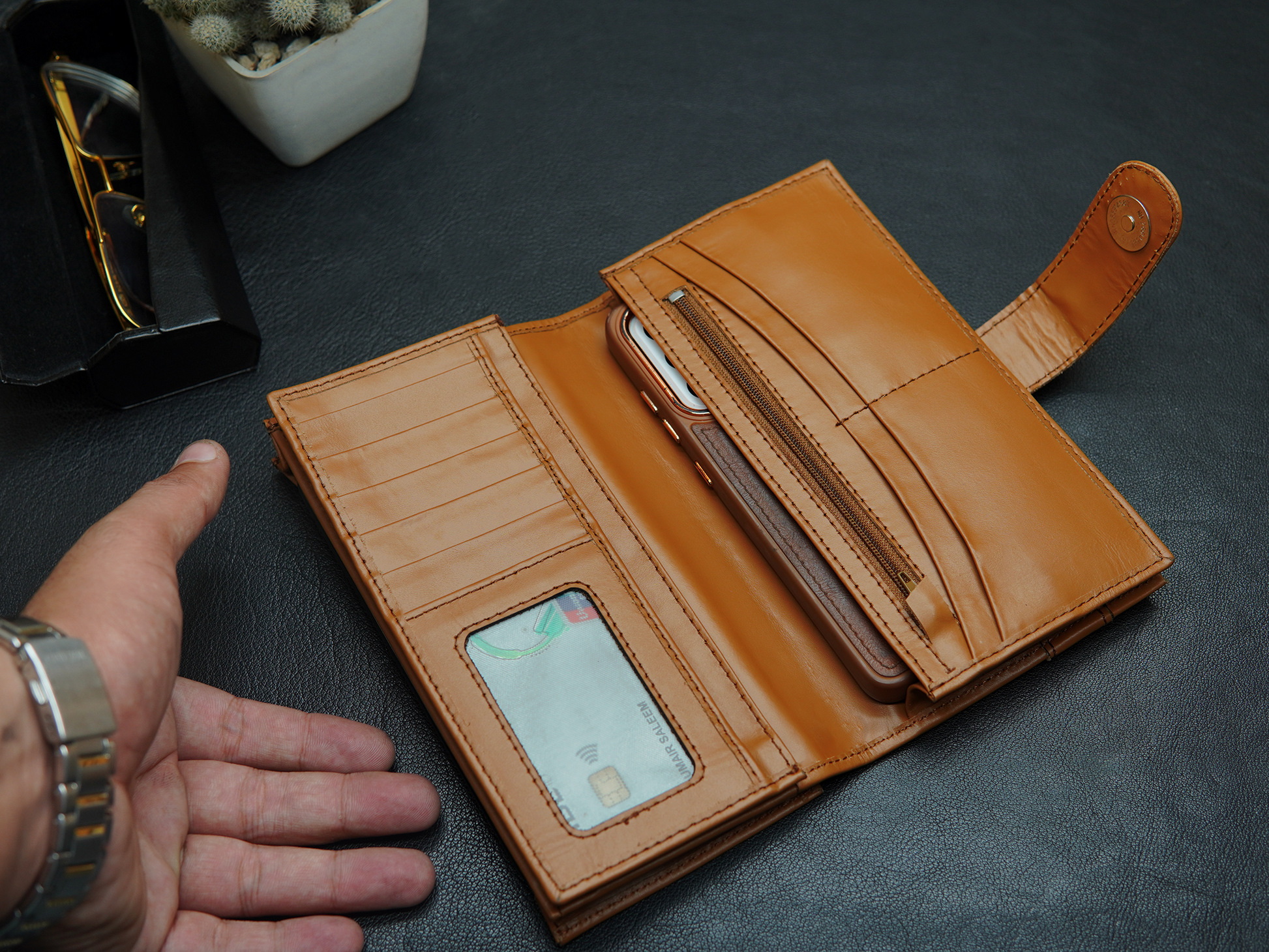 Discover Grandeur, a handcrafted long leather wallet designed for those who need maximum storage with timeless style. Featuring 11 card slots, multiple compartments for cash and documents, and a dedicated space that easily fits your mobile, this wallet offers unmatched functionality. With its slim profile, premium full grain leather, and expert craftsmanship, Grandeur is the perfect choice for professionals and travelers alike.