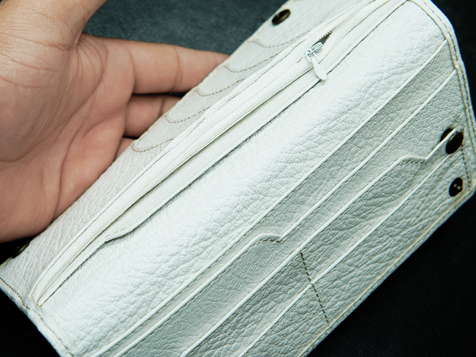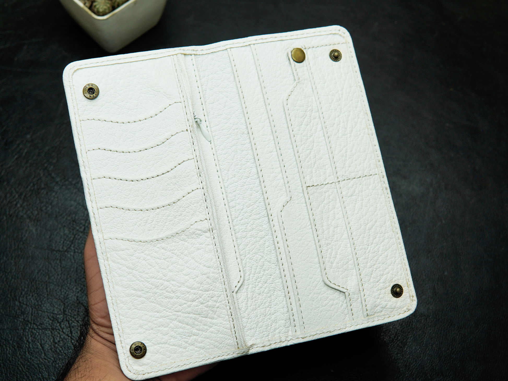 Introducing Lenova, a luxurious white bovine leather long wallet designed for those who value style, organization, and functionality. With 8 dedicated card slots, 1 memo slot, 2 spacious cash compartments, and a passport compartment, Lenova keeps all your essentials neatly organized in one sophisticated accessory.